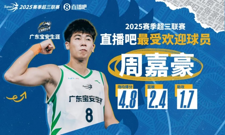 来自广东宝安生涯的周嘉豪本赛季场均能够贡献4.8分2.4篮板1.7助攻,以24292票当选“票王”,斩获『 x 超三联赛最受欢迎球员』荣誉